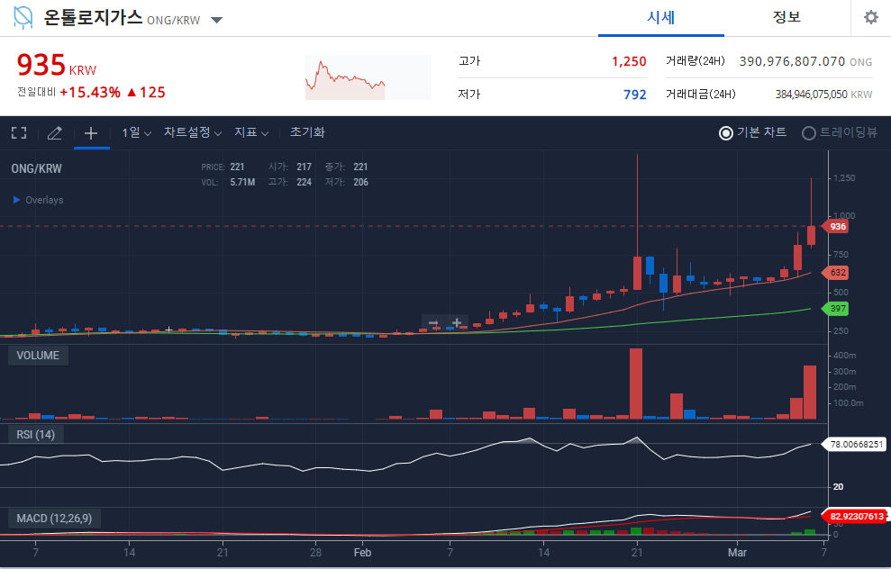 온톨로지가스 코인은 2월 초까지 평균 230원 가량을 횡보하였습니다. 2월 이후에는 꾸준하게 우상향 하다가 2월21일 엄청난 거래량과 함께 펌핑이 일어나면서 비트코인이 엄청난 하락을 하던 2월 22~23일에도 500원선을 지키다가 비트코인의 회복과 동시에 가격 회복 후 횡보하다가 다시 급상승이 일어나면서 현재 높은 상승률과 함께 900 ~ 지폐(1000원 이상)의 가격대를 보이고 있습니다.