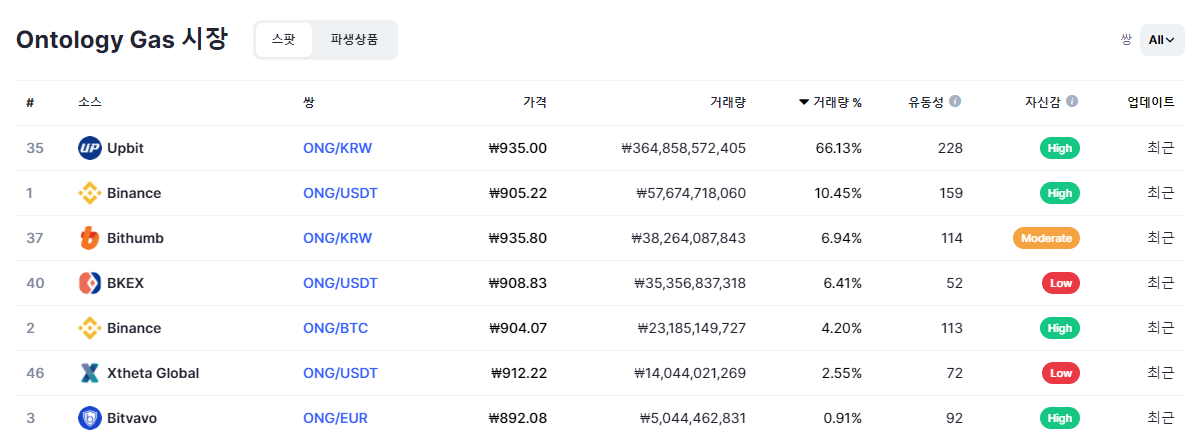 기본적으로 온톨로지 가스는 50개 이상의 거래소 및 마켓에 상장되어 있는데, 다양한 거래소에 코인이 상장되어 있다는 것은 유동성 측면에서나 구매 및 판매 편의성에서 도움이 되기에 엄청난 장점입니다. 또한 거래량이 업비트 및 빗썸에서만 99퍼센트를 차지하는 국내산 코인들과 달리 바이낸스 및 해외 거래소에서도 충분한 양의 거래량이 터져나오고 있기 때문에 가격상승의 여지가 충분하다고 판단됩니다.